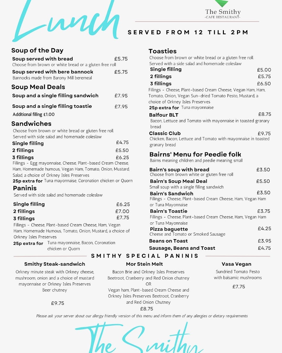 The Smithy Cafe shines with its vibrant menu, offering delectable choices that cater to all tastes. Savor the Smithy Steak Sandwich, a hearty delight that promises to satisfy, or indulge in the Mor Stein Melt that oozes tantalizing flavors. For those seeking a plant-based option, the Vasa Vegan is not to be missed, packed with wholesome ingredients that showcase the cafe’s commitment to inclusivity. Families will appreciate the Bairns' Menu for Peedie Folk, filled with kid-friendly options such as the delightful Bairn's Soup with Bread or a satisfying Bairn's Toastie.
